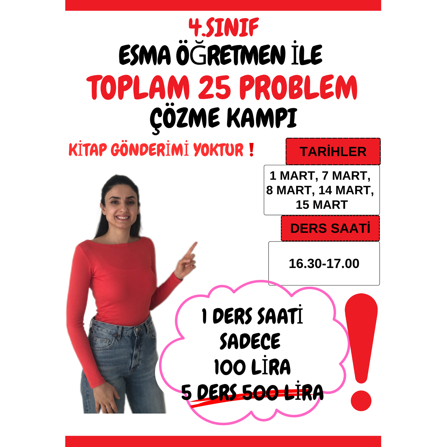1 ders saati sadece 100 TL. 5 gün 5 ders toplam 500 TL. Tarih seçmiyorsunuz. Yazan tarihlerin hepsinde 1 ders saati yani 30 dakika ders olacak. Ders, zoom üzerinden canlı olarak yapılacak. Derse katılamadığınız günler için dersler kayıt olacak. 1 Nisan tarihine kadar ders kaydını izleyebilirsiniz. Sepete 1 tane ekleyerek satın alma işlemini yapın. Satın alma yaparken Mobil Telefon bölümüneWhatsApp a eklenmek istediğiniz numarayı yazın.WhatsApp grubu 26 Şubat’ta oluşturulacak. 0543 139 21 42 ve 0543 102 42 21 nolu numaralar ile whatsap grubuna ekleneceksiniz. WhatsApp gruba sadece 1numara eklenecek. Bu iki numarayı telefonunuza kaydedin. Zoom ders linki her ders günü gruptan paylaşılacaktır. Bilgisayar, tablet, telefon herhangi biri ile kampa katılabilirsiniz. Cihazınızda zoom uygulaması olması yeterli. 5 dersimizde toplam 25 problem çözeceğiz. Problem çözme teknikleri tüm detaylarıyla anlatılacak. (4.sınıflar için toplama,çıkarma,çarpma,bölme,kesirler ve zaman problemleri olacak.) 25 problem WhatsApp grubu oluşturulduktan sonra gruba PDF olarak whatsapp grubuna gönderilecek. Çıktı alabilirsiniz. Çocuklar çözmesin. Ders başladığında çözülecek. GRUPTAKİ KİŞİ SAYISI KATILIMA GÖRE FARKLILIK GÖSTERMEKTEDİR. Birebir problem çözümü yapılmıyor. DERS ESNASINDA ZOOM DA ÇOCUKLAR SESİNİ AÇMIYOR. Öğretmenimiz anlatacak çocuklar dinleyecek. Grup derslerimizde kişi sınırımız yoktur. Herkes evinde birebir izlediği için kişi sayısının çocuğa etkisi yoktur. NOT: KİTAP GÖNDERİMİ YOKTUR.